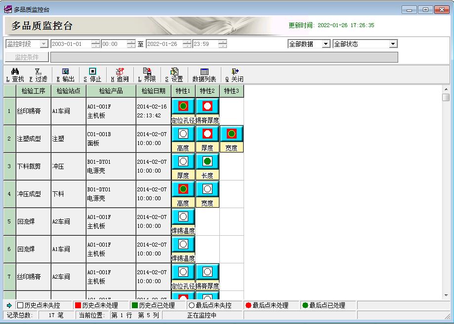 此窗口可以看到多個產(chǎn)品,多項(xiàng)特性最后一組數(shù)據(jù)的監(jiān)控狀態(tài):正常、警示、超規(guī)格界限、超管制界限;同時可對每一條記錄進(jìn)行圖形分析、查看歷史狀態(tài),對異常記錄進(jìn)行異常分析、異常圖形保存、8D-CAR等,有必要的話還可以自動發(fā)送郵件給指定人員;適合于上層領(lǐng)導(dǎo)人員對企業(yè)各部門的質(zhì)量狀況的全盤掌控。