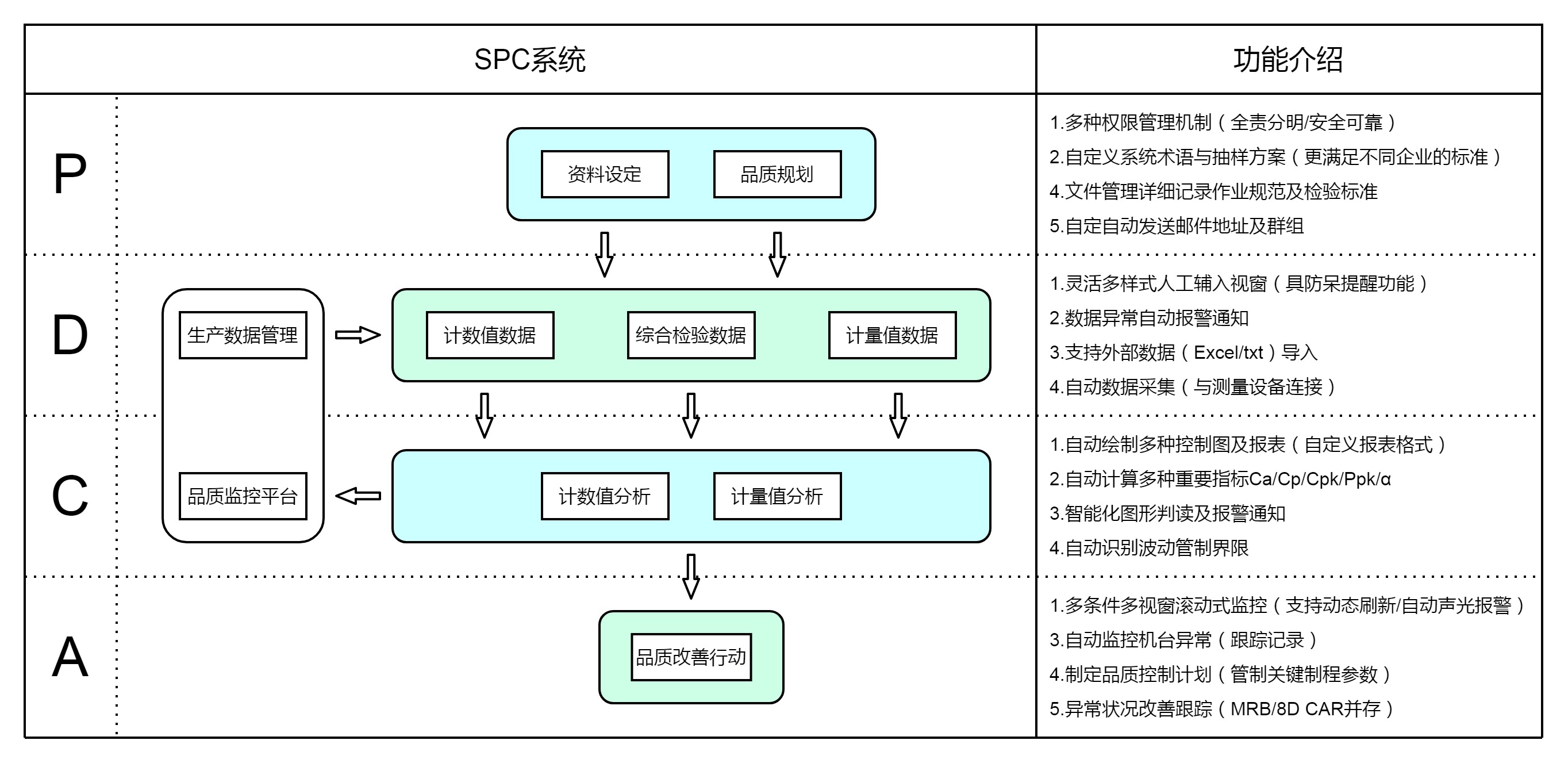 『品冠』SPC系統(tǒng)重點(diǎn)是是依據(jù)Define(定義) 、Measure(測(cè)量) 、 Analyze(分析) 、 Improve(改善) -> Control(控制) ,即應(yīng)用DMAIC模式來(lái)對(duì)質(zhì)量過程進(jìn)行改善及監(jiān)控的。借助SPC分析手法,及時(shí)發(fā)現(xiàn)問題,不斷地分析質(zhì)量問題中各種影響因素,分析影響質(zhì)量問題的主要原因,針對(duì)主要原因,采取解決措施,并進(jìn)行針對(duì)性預(yù)防在下一循環(huán)中改進(jìn),從而達(dá)到持續(xù)改進(jìn)的目的。建立一套安全、持續(xù)、不斷改善的SPC系統(tǒng),讓企業(yè)人員都參與進(jìn)來(lái),產(chǎn)品質(zhì)量不斷提升,對(duì)企業(yè)的利益也是非常巨大的;以下為《系統(tǒng)質(zhì)量改善流程》: